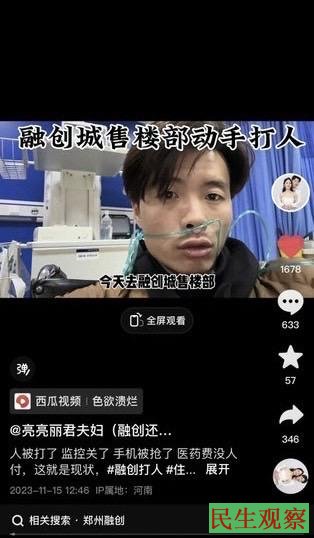 【民生观察2023年11月17日消息】2023年11月15日,著名的烂尾楼维权夫妇亮亮和丽君发布一系列视频,称自己前往郑州融创城维权索要此前欠的2万块钱,遭遇融创员工殴打,并且手机、车钥匙被抢走,汽车轮胎被扎。报警后警察未处理打人者,只是让他回去等消息。