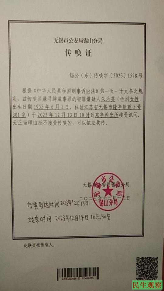 【民生观察2023年12月17日消息】近日,江苏省无锡市锡山区东亭街道的朱乐英,前往北京信访并旅游,被东亭派岀所人员强行带回后,以寻衅滋事为由连续传唤并抄家。为了防止其再次前往北京上访,警方对朱乐英作出取保候审的决定。