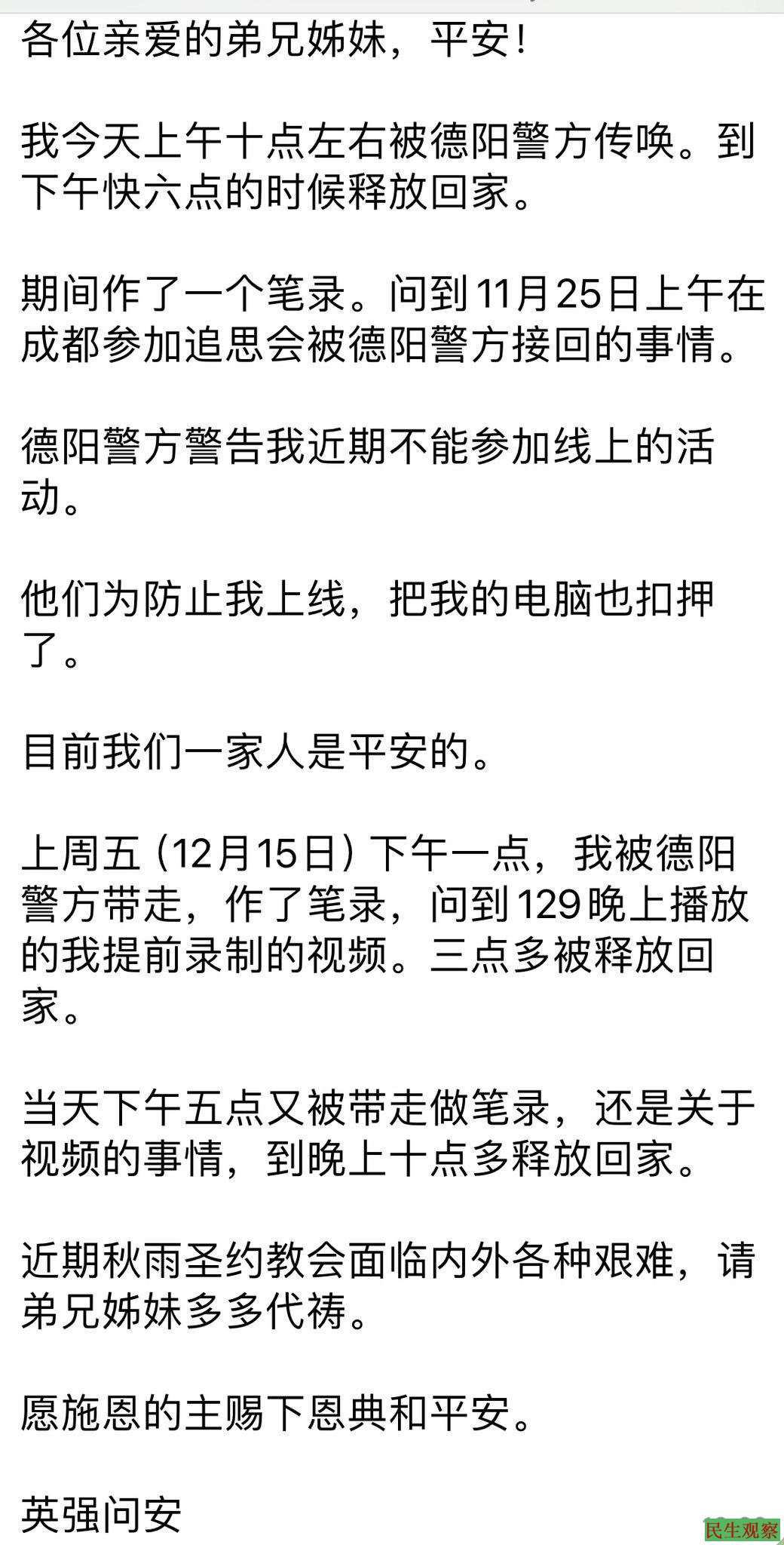 2023年12月15日下午一点,李英强长老被德阳警方带走作笔录,问到12.9晚上播放的他提前录制的视频。三点多被释放回家。