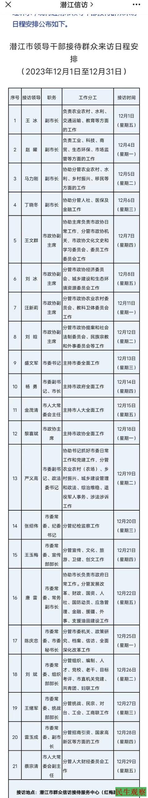 【民生观察2023年12月26日消息】湖北潜江市政府在2023年12月1日对外公开公布由潜江市委书记,市委副书记,四位副市长,四位政协副主席,市人大常委会主任,市政协主席,市委副书记政法委书记,市常委宣传部部长,市常委统战部部长,市常委副市长,市人大常委会副主任,市委常委市秘书长等相关领导对本市信访接访工作一个月的安排。