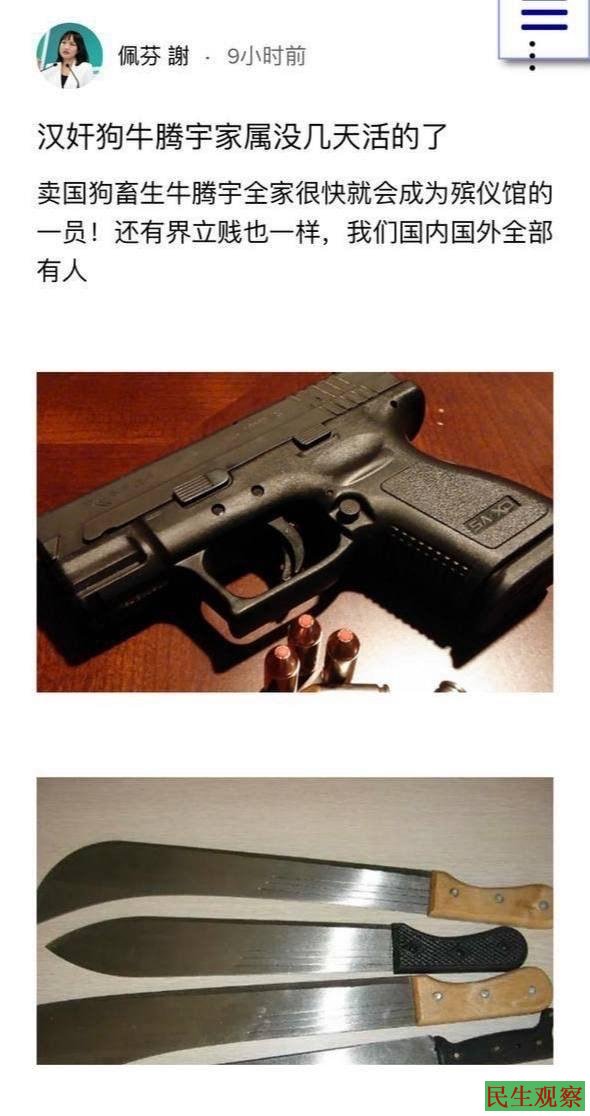 12月29日牛腾宇母亲可可说:“近日,广东政法匪帮又对我发出了死亡威胁,居然冒充谢佩芬女士,声称要杀了我和界立建先生,狂妄的声称其在‘国内国外都有人’,还配了手枪和砍刀的图片。(如下图)