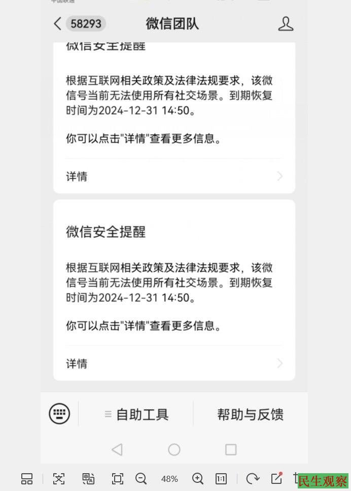 2024年1月1日高瑜推特消息:“质问腾讯微信团队:2023年8月17日,你们限制了我的微信所有功能,你们规定恢复时间为2023年12月31日,昨天晚上我刚刚通过了申请恢复,今天上午收到一些朋友的问候,我还没来得及回复,就又收到你们的限制使用所有微信功能的通知,限制时间又是一整年。