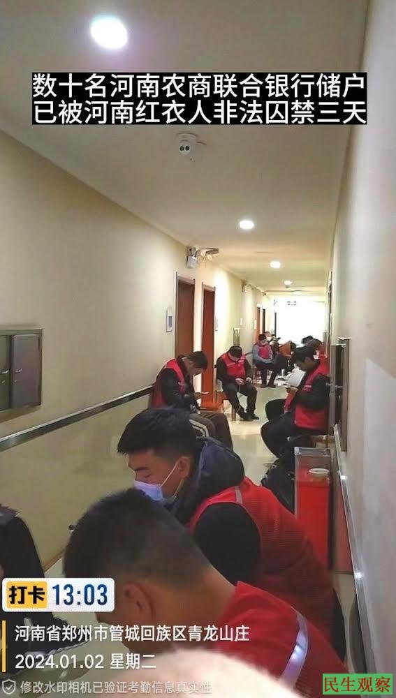 【民生观察2024年1月4日消息】近日,河南村镇银行维权储户数十人乘坐高铁前往郑州讨要自己的存款,下火车后随即被十几名不明身份的“红马甲”拦截带走关进黑监狱,一部分储户的手机被收走。目前截止到2024年1月2日,储户们正在以绝食进行抗争。