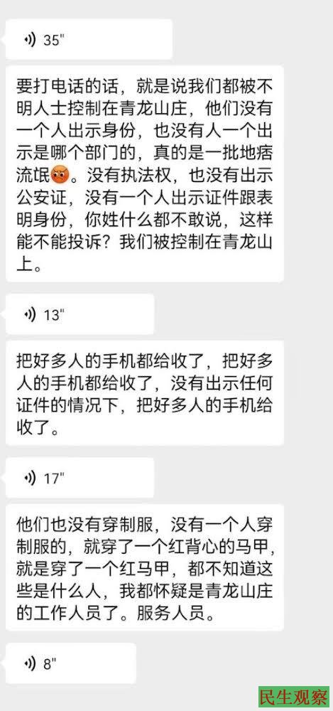 他们在没有出示任何证件的情况下,把好多人的手机都给收了。他们也没有穿制服,没有一个人穿制服的,就穿了一个红背心的马甲。都不知道这些是什么人,我都怀疑是青龙山庄的工作人员了。