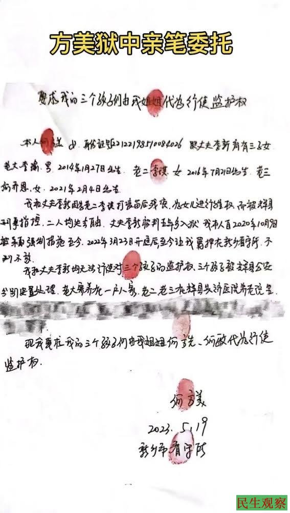 2024年1月7日,河南新乡市辉县政府一行人,前往何方美大哥家(浙江)找到七十五岁不识字的何妈妈,哄骗其说何方美丈夫李新马上就出来了(李实际刑期至2025年10月),使得其在放弃抚养权文件上按手印。