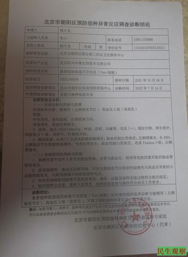 北京新冠疫苗受害者:钱大龙(15911150698)