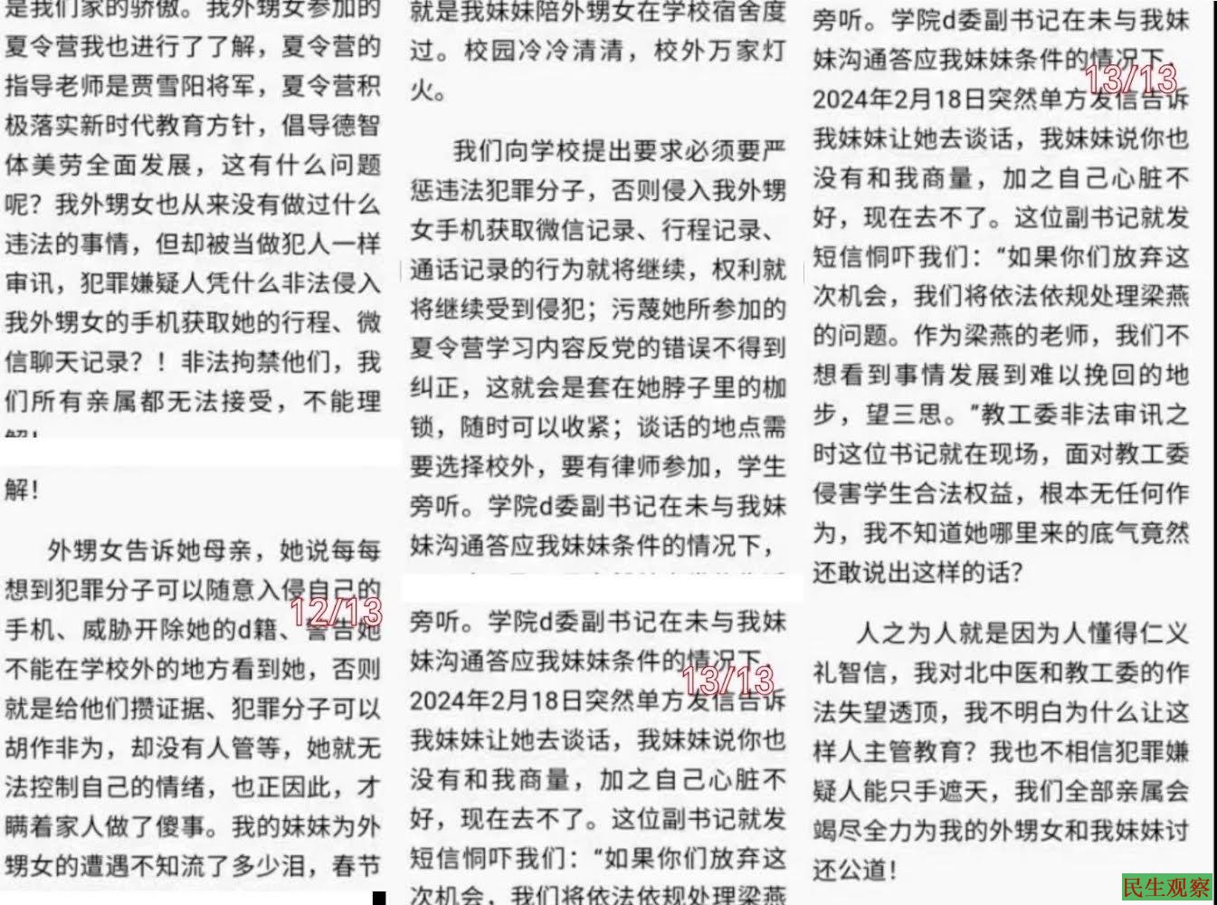 【民生观察2024年3月7日消息】北京中医药大学女研究生梁燕因参加一个名为“走正道行远路”的夏令营,被北京教工委指控反党带走后进行非法审讯,因不堪压力梁燕服药自杀,后被送医进行抢救。家人和男友因陆续为其维权离奇失联。