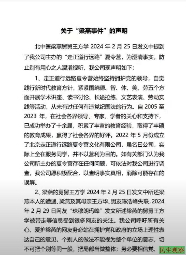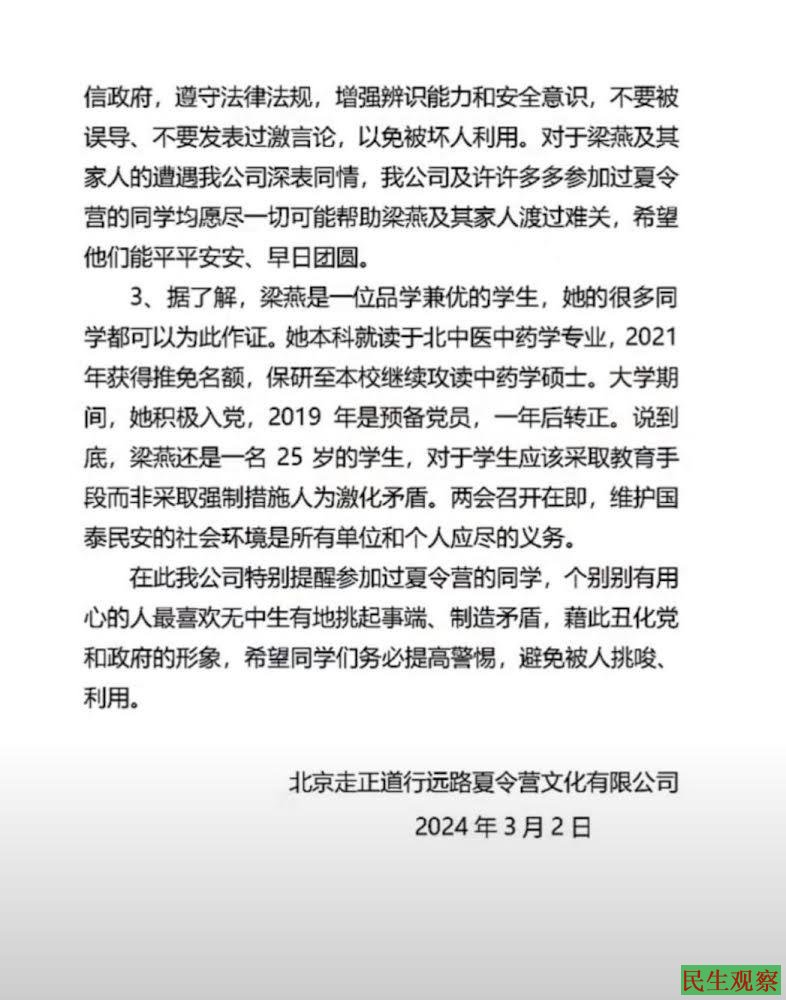 3月2日,“走正道行远路夏令营”官方发布声明称,夏令营坚持拥护党的方针,从未有过任何违反党纪法律行为。对于梁燕的遭遇深表同情,希望他们一家早日团圆。在此提醒个别参加夏令营的同学,个别别有用心的人喜欢无中生有丑化党和政府的形象,希望同学们提高警惕,避免被人挑唆、利用。