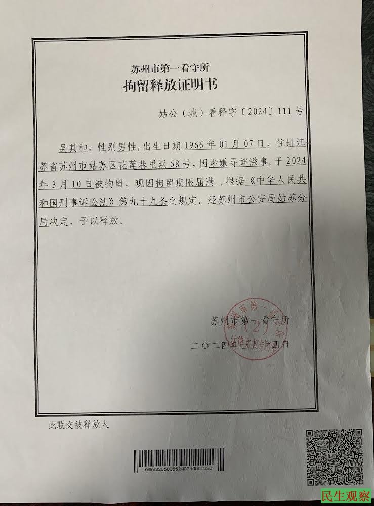 【民生观察2024年3月17日消息】近日,苏州公民吴其和因不服判决继续控告被姑苏警方刑事拘留,家中被警方上门搜查,行政诉讼材料被搜走,家人还被打伤。14日,吴其和期满获释。