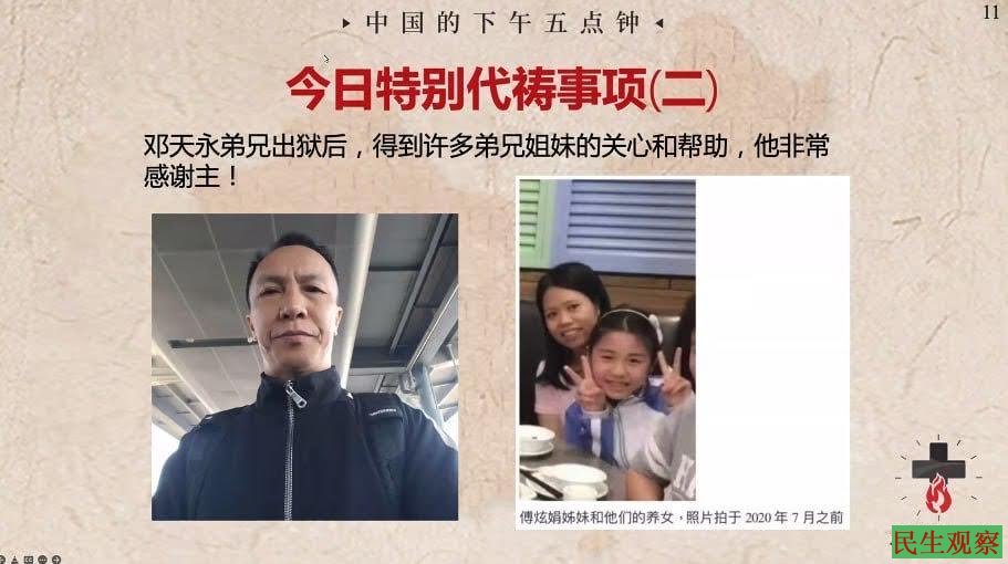 邓弟兄夫妇没有⽣育孩⼦,他们领养了亲戚的⼀个女⼉,女儿从⼩跟他们夫妇⼀起⽣活,现今16岁。邓弟兄夫妇被抓时,她还不到13岁,之后被弟兄姊妹带到菲律宾上学。邓弟兄出狱后,女儿回来了,但是邓弟兄刚出狱,⾝体和经济各⽅⾯情况都很糟糕潦倒,有⼀只眼睛坏了(他原来有轻度⻘光眼,在看守所被泼辣椒⽔,被电击,加重疾患),需要治疗。⼤家看他无法帮助女⼉继续上学,⼜把他女⼉带回菲律宾。