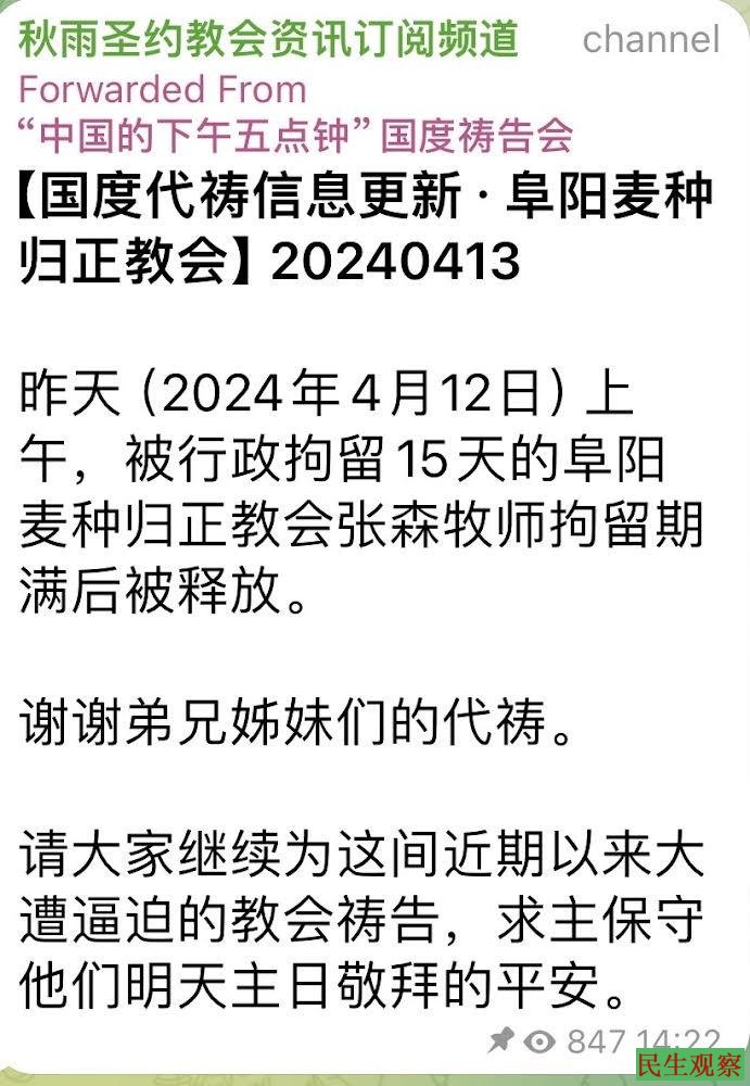 昨天(2024年4月12日)上午,被行政拘留15天的阜阳麦种归正教会张森牧师拘留期满后被释放。