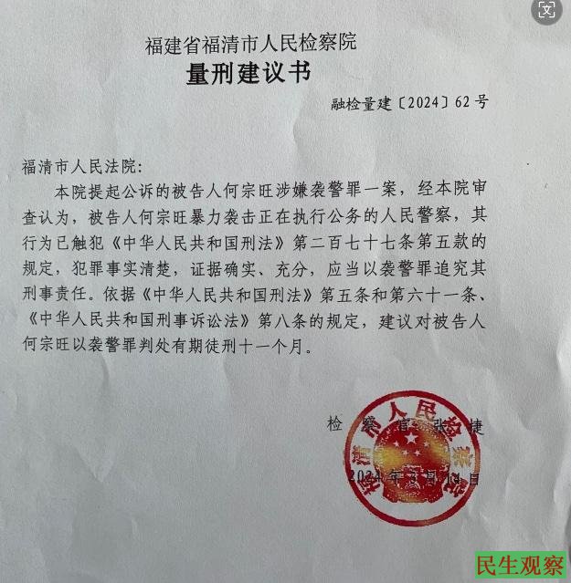 二、福清市人民检察院2024年3月14日作出的量刑建议书建议对何宗旺“袭警”罪判有期徒刑十一个月,而福清法院给何宗旺判十五个月的刑罚,这依据什么?恐怕与不让旁听有关(见不得人的罪名)。