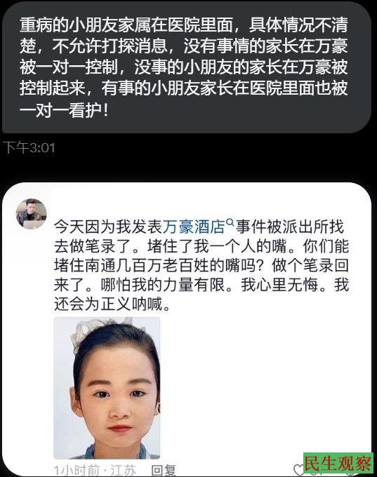 该名网友表示:“今天因为我发表万豪酒店事件,被派出所找去做笔录了。堵住了我一个人的嘴,你们能堵住南通几百万老百姓的嘴吗?做个笔录回来了。哪怕我的力量有限,我心里无悔,我还会为正义呐喊。”