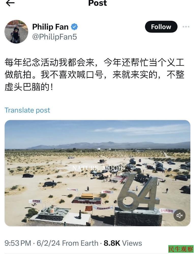 2024年6月3日,网友“@philipFan5”在X上发布了自由雕塑公园航拍的“六四纪念活动”&“共产主义受难者纪念碑落成”的视频,并留言:“每年纪念活动我都会来,今年还帮忙当个义工做航拍。我不喜欢喊口号,来就来实的,不整虚头巴脑的!”