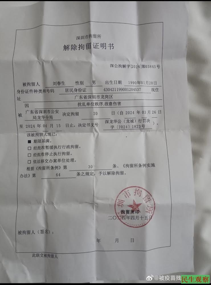 【民生观察2024年7月24日消息】深圳打工人刘春生的女儿刘梓悦,因接种疫苗出现严重的异常反应,经治疗后留下严重的后遗症导致残疾,刘春生向深圳相关部门多次讨要说法,不但遭到推诿,还被深圳警方多次打压拘留。