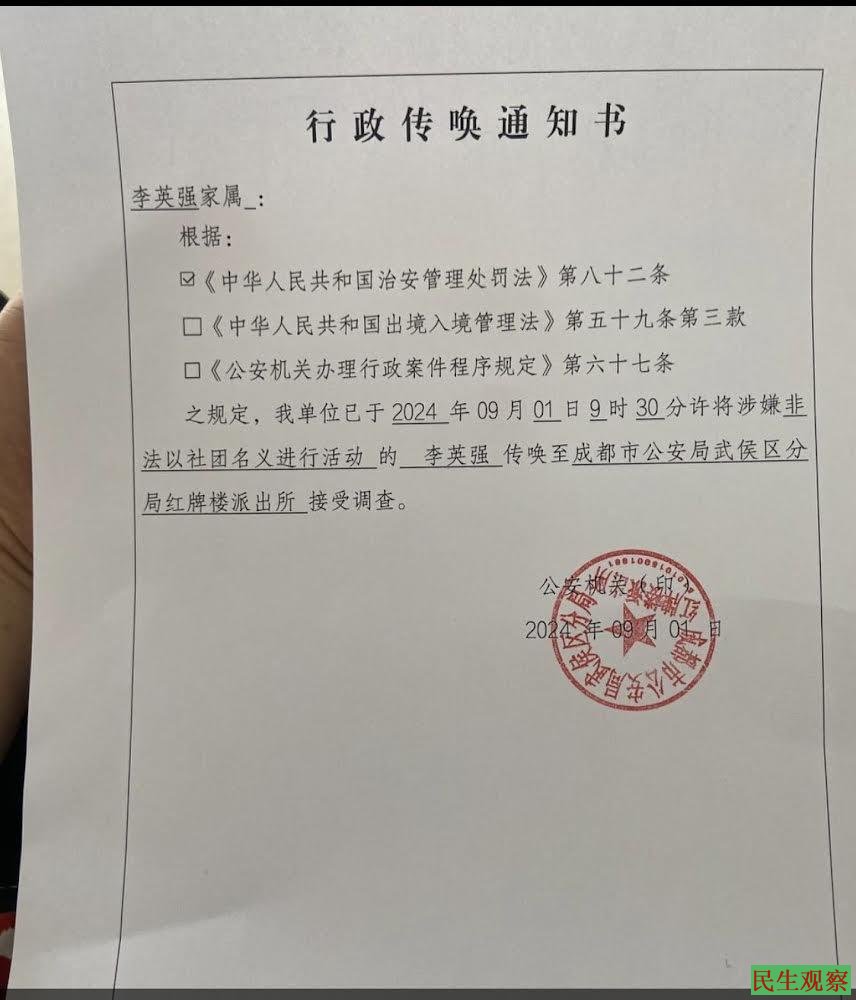【民生观察2024年9月3日消息】2024年9月1日主日上午,成都秋雨圣约教会在一处租用的场地进行线下聚会,随即遭到成都警方的冲击。李英强长老、吴五清传道、晏鸿长老(通知书上写的李友洪)以及曾庆涛副执事先后被警察带走传唤。至9月2日中午时分,得知四人均被警方以非法社团名义进行活动为由处于行政拘留。