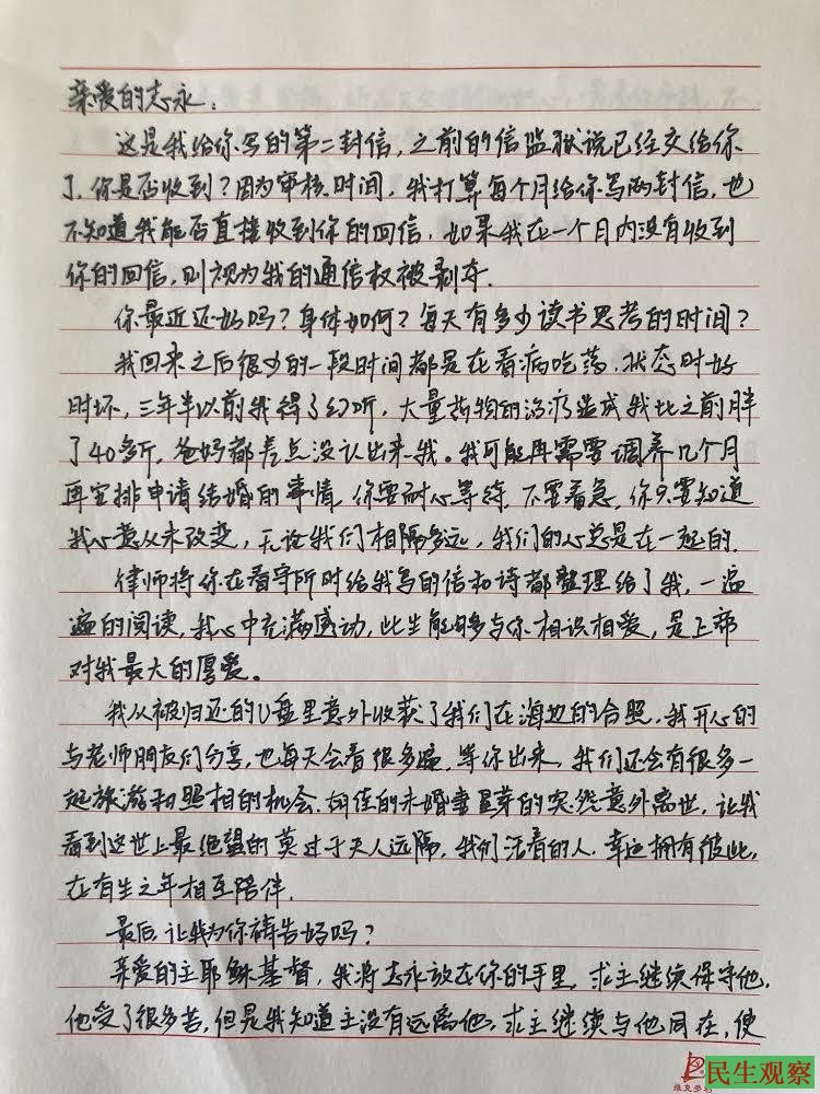 【民生观察2024年9月4日消息】北京人权护卫者李翘楚于2024年8月3日刑满获释,至2024年9月3日已经出狱一个月了,其在家人和友人的陪同下前往医院就诊,目前身体状况有所好转。另翘楚写给男友许志永的2封书信,志永已经收到,并已给她回了信。