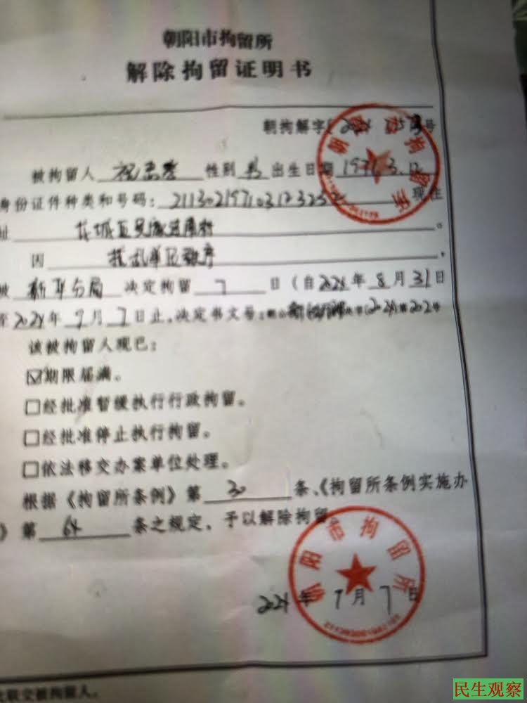 【民生观察2024年9月9日消息】辽宁维权人士祝忠孝在2024年8月30日上午在北京东堂子胡同西口协和医院旁边的米市大街公交站被辽宁朝阳区公安局新华分局李建等人拦截,报警后被建国门派出所。以职务行为为由不予立案,只能回地方公安局纪检监察控告,随后又在北京南站106路公交终点站,再次被辽宁朝阳市公安局新华分局七人绑架到驻京办实施打击报复,捏造证据向领导上交所谓的笔录,将祝忠孝投进辽宁省朝阳市拘留所,拘留的所谓理由是:依已签订了息访罢诉协议再次上访,给予行政拘留,2024年9月7日拘留期满释放回家。