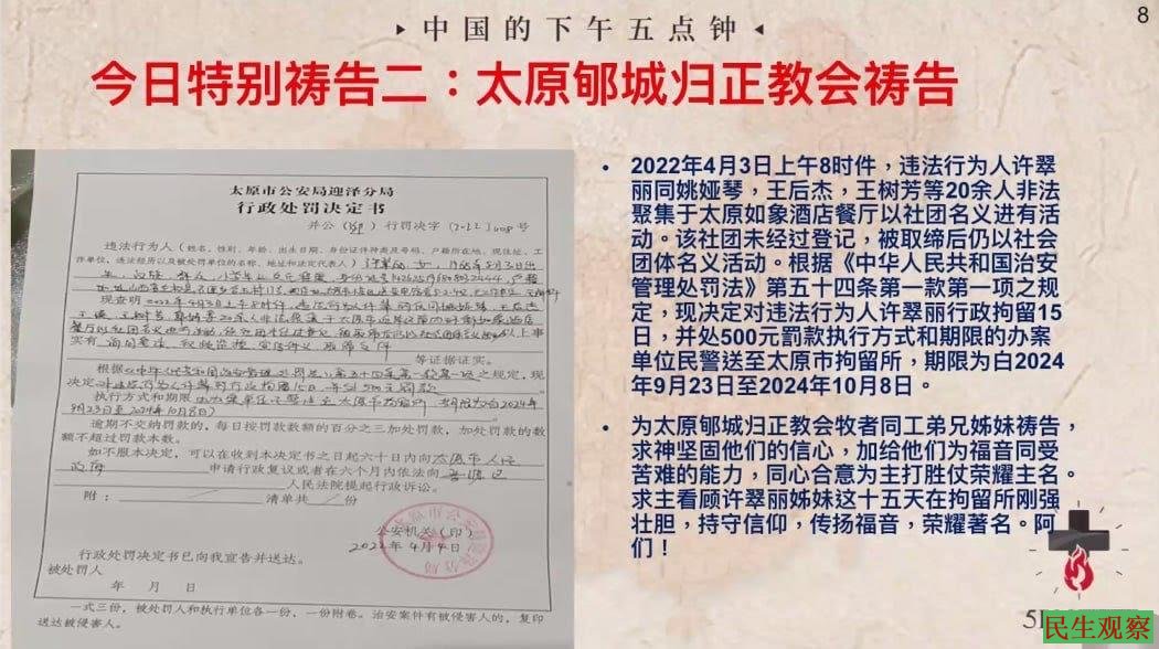 【民生观察2024年9月24日消息】太原郇城归正教会许翠丽因在2022年4月3日与教会弟兄姐妹在酒店餐厅吃饭聚集,被当地警方处以行政拘留15日,并处500元罚款。由于当时是疫情期间延期执行,许翠丽姐妹于昨日被行政拘留。请大家为太原郇城归正教会祷告,求主看顾许翠丽姊妹和她的家。