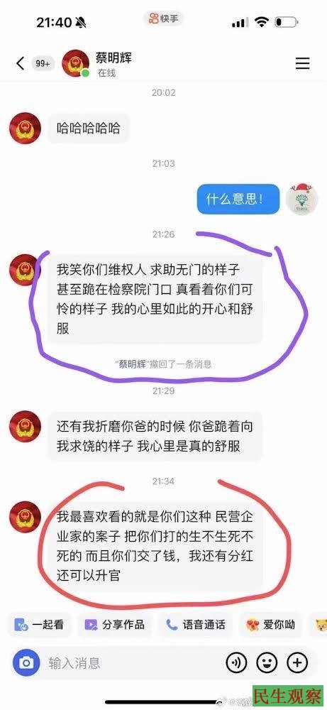 对此,罗灿宏猜测,“如果是普通人的恶作剧,他为何对我家人发生的伤害如此清楚。比如爸爸被打伤打残至今不认罪。比如爸爸被打到跪着求饶说要打死了,疼死了。比如我在检察院门口下跪讨公道,要更高领导监督却无人理会。比如法官逼爸爸认罪认罚就可以轻判,可以少受点苦。比如蔡明辉的手下,罗丰警官曾在囚禁爸爸的房间摄像头下亲口说:“是领导要搞你,所以我们兄弟伙只能搞你,你也别怪我们”。比如他说要我少点投诉,不许维权,不管我怎么办他照样升官发财。