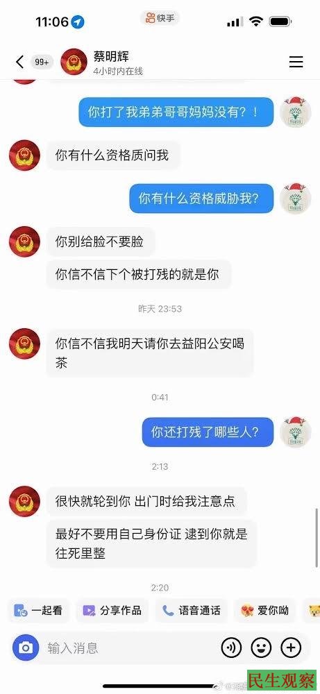 因罗树中(申请人父亲)遭受刑讯逼供,蒙受冤屈,申请人为替父维权,一直通过网络直播呼吁大家关注罗树中案件的进展。2024年9月19日凌晨20分,申请人收到了自称是益阳414案办案人员“蔡明辉”的信息,“蔡明辉”通过快手平台向申请人发私信称:“你还在网上乱说,小心怎么死的都不知道!”