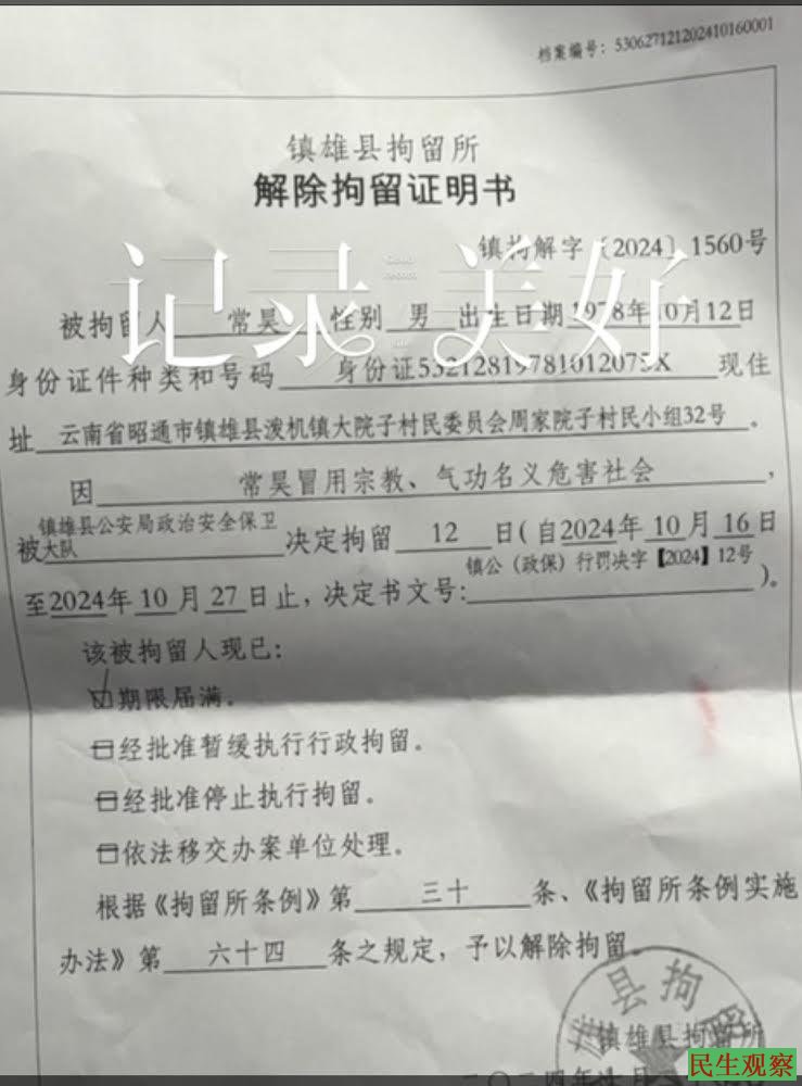 到15号晚上12点,曹三强牧师也被释放。常昊传道则被镇雄警方行政拘留12天,罪名为“冒用宗教、气功名义危害社会”。