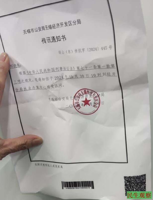 【民生观察2024年10月31日消息】近日,江苏无锡残疾女子邹晓燕去无锡经开区太湖街道,找党委书记袁江飞举报控告太湖街道政法委员周潇彬打人,袁书记不但拒绝接见邹晓燕,而且利用公安机关对其正当的举报控告行为进行打压。10月30日,邹晓燕被无锡东绛派出所传讯,关押在华庄派出所长达20个小时左右。31日早上9点50分左右,邹晓燕才获得释放。
