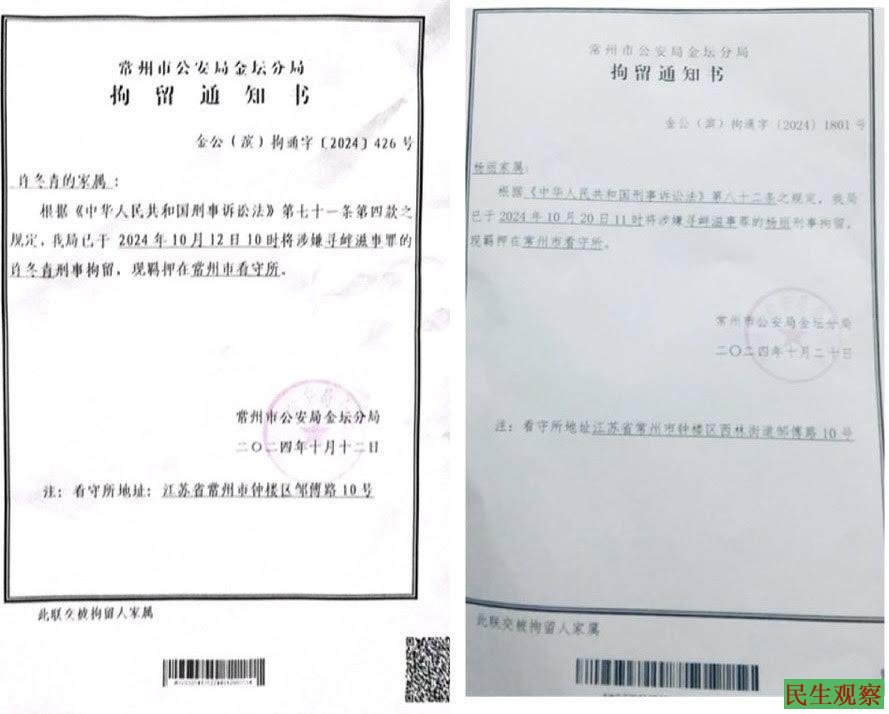 拘留通知书显示,许冬青于2024年10月12日10时,被常州市公安局金坛分局以涉嫌寻衅滋事罪刑事拘留,现羁押在常州市看守所。