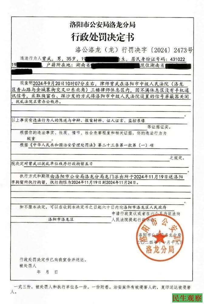 【民生观察2024年11月21日消息】2024年9月下旬,曾武律师在洛阳中级人民法院休息室上网时发现没有信号,查询发现法院居然违规使用了信号屏蔽器,专门断律师的信号。于是,曾武律师就把信号屏蔽器关掉了,过程中无意碰掉了信号屏蔽器,后被带往附近派出所,并欲对其进行行政处罚。近日,曾武律师被洛阳市公安局洛龙分局,以扰乱单位秩序给予行政拘留5天的处罚。