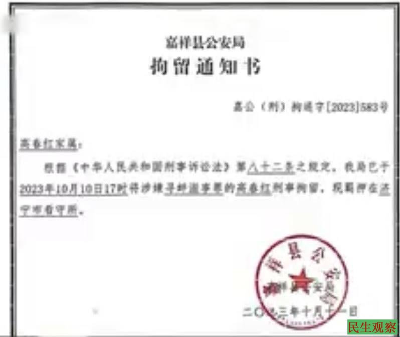 2023年10月10日,警方以高春红在“高长河仓库被盗案”中涉嫌“寻衅滋事罪”为由,对高春红刑事拘留,而高春红和“高长河仓库被盗案”没有关联,她没去过案发地点,没有接触过涉案财物,没有发表过相关言论。