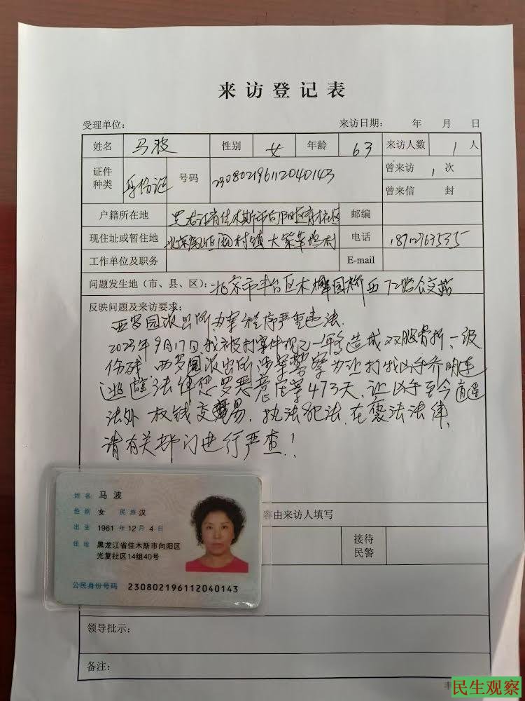 【民生观察2024年12月24日消息】近日,黑龙江维权访民马波再次来到北京市丰台区检察院,询问自己被打一案的进展情况,结果遭到公检法部门的推诿踢皮球。随后,马波前往相关部门投诉丰台区人民检察院徇私枉法。