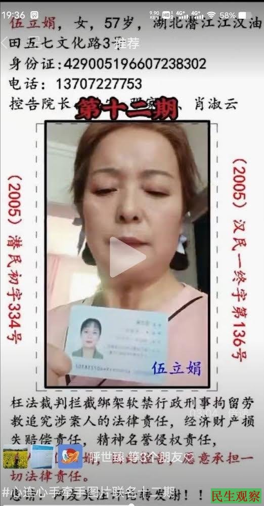【民生观察2025年1月3日消息】2025年元月2号上班第一天,湖北潜江维权人士伍立娟2004年被非法下岗至今已经21年了。