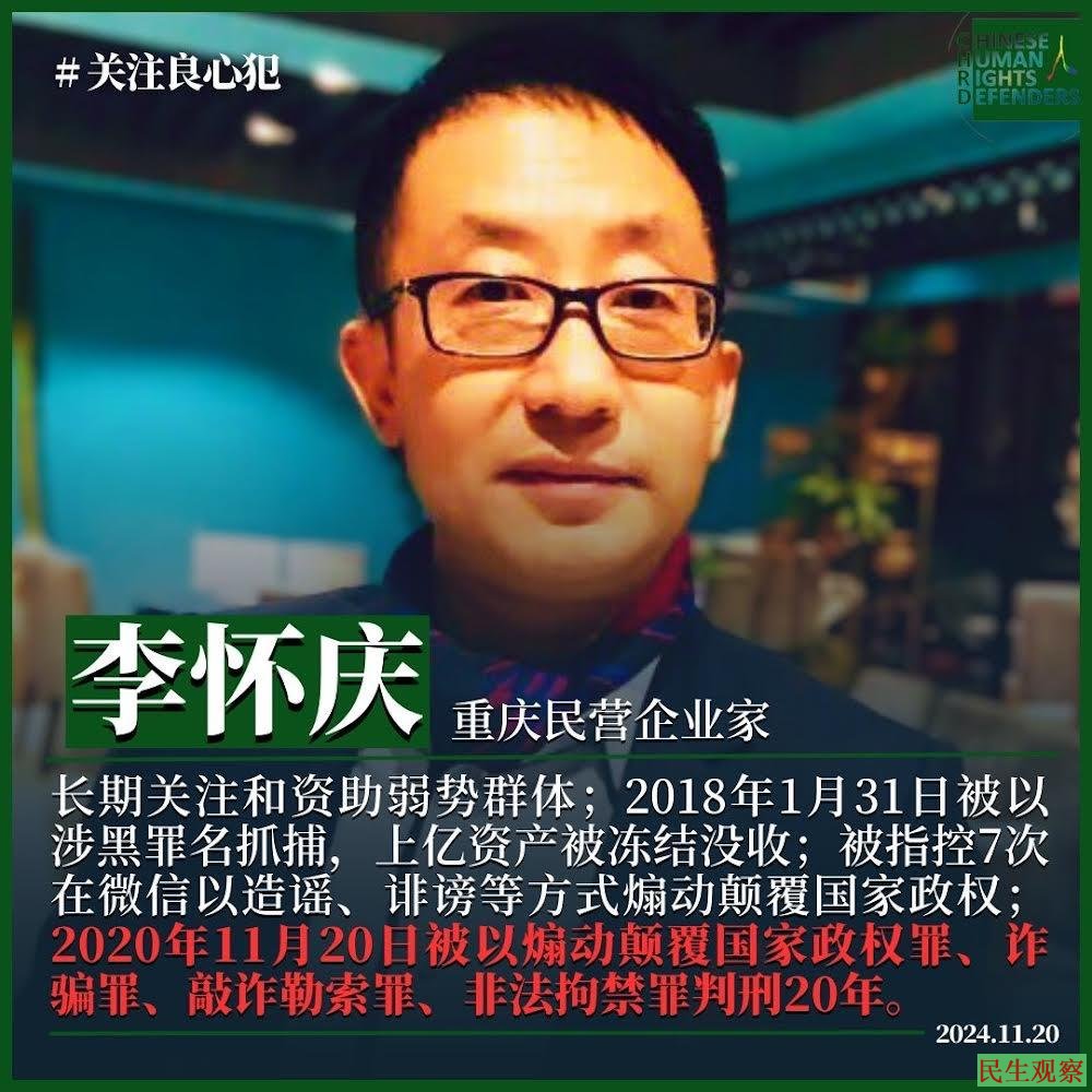 2025年1月15日,李怀庆妻子包艳发文称,“紧急呼吁,我先生李怀庆在贵州兴义监狱内因营养不良面临健康问题,我恳请大家关注!