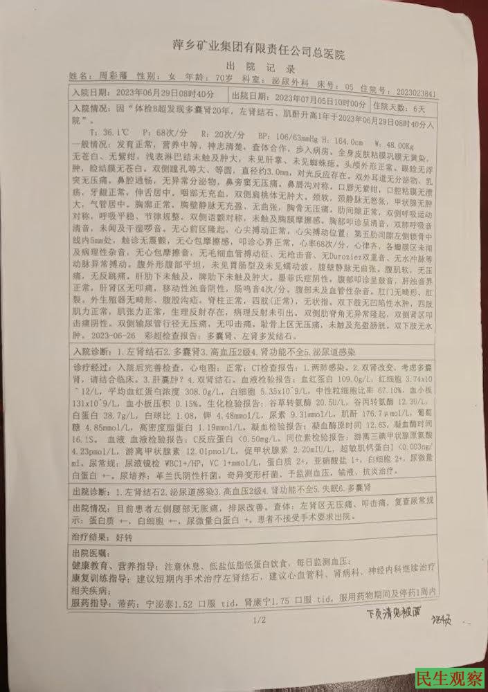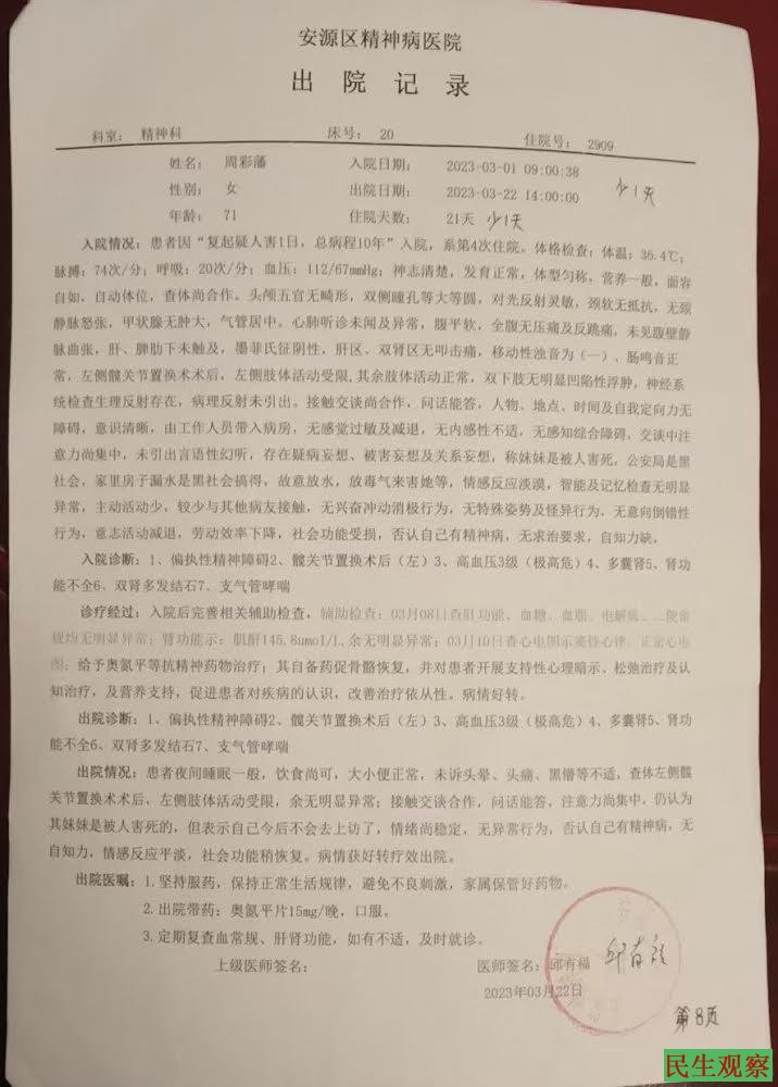 据周彩藩称,此前她在萍矿总医院精神科全身体检时显示,各生命体征正常。但在安源区五陂精神科住院后疑似被投毒得了十几种病,她多次向院方提出要求转院治疗,但都遭到拒绝.