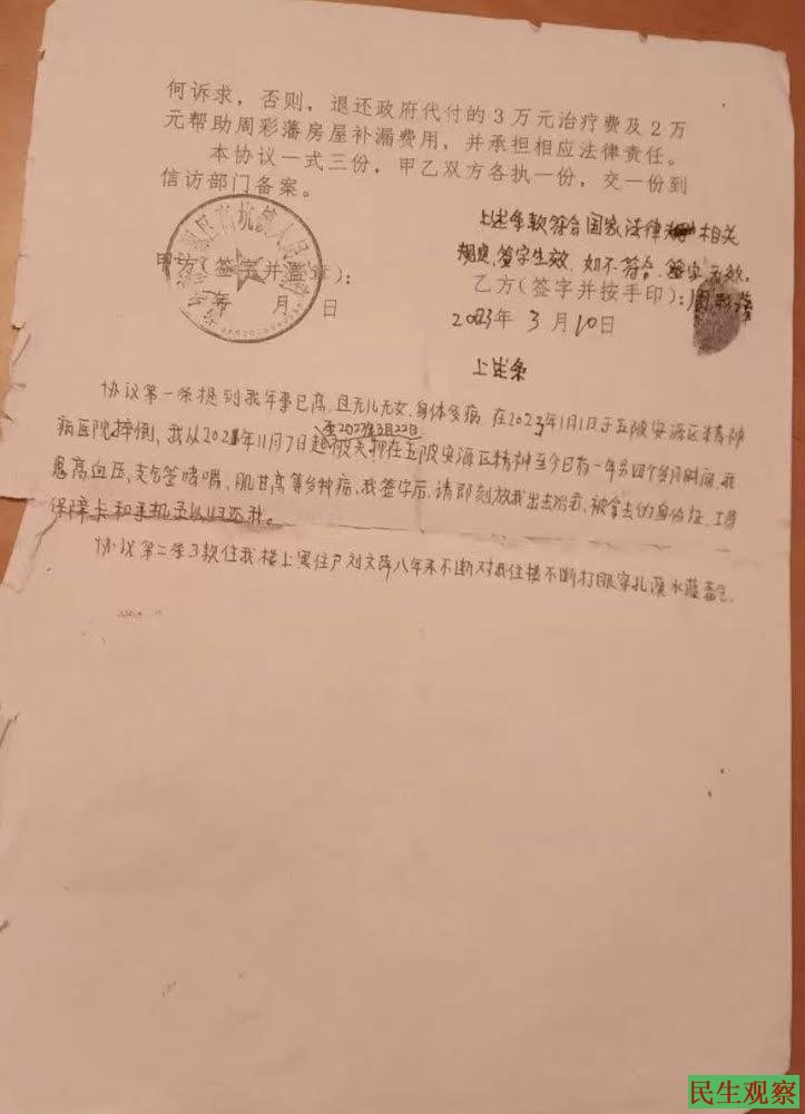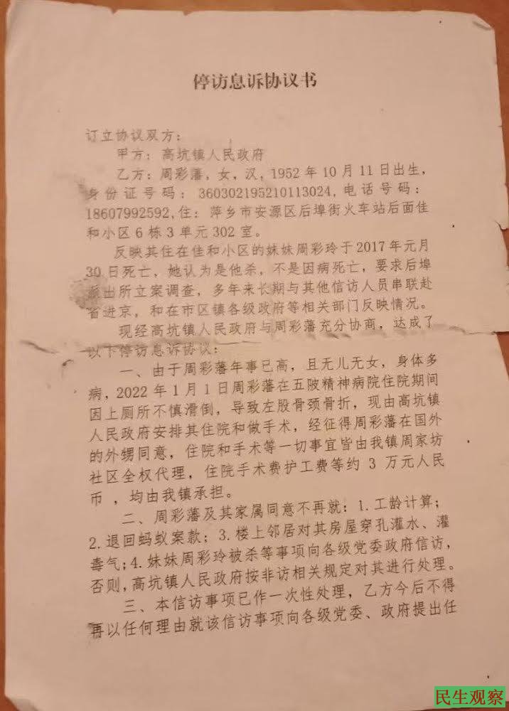 2023年3月10日,周彩藩在万般无奈之下只好与镇政府签署了停访息诉协议,之后于3月22日被释放回家。此时她的手机、身份证、社保卡等才归还给她。