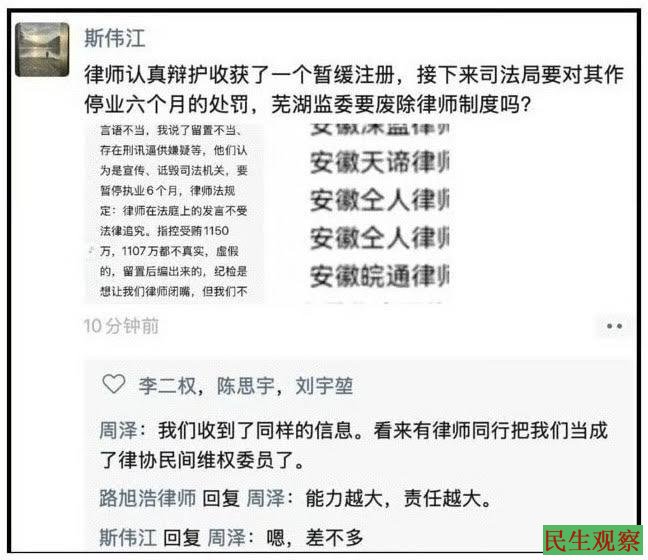 【民生观察2025年5月21日消息】近日,安徽芜湖律师戈运龙向法律界及公众求助,他称在为职务犯罪被告人凤海飞辩护时,只因在庭上指出司法机关对凤海飞留置不当,并且还存在刑讯逼供嫌疑等。被当地监委认为是在诋毁司法机关,要求暂停执业6个月。随后,北京徐冯彬律师发朋友圈表示,自己可以证明戈律师的庭审发言并不出格,他猜测是芜湖市监委的某个办案人,原来指控了凤海飞受贿既遂650多万,经过他们的辩护,一审法院部分采纳了律师的观点,把既遂部分降低到300万以下。目前,这篇文章已被各个平台陆续删除。