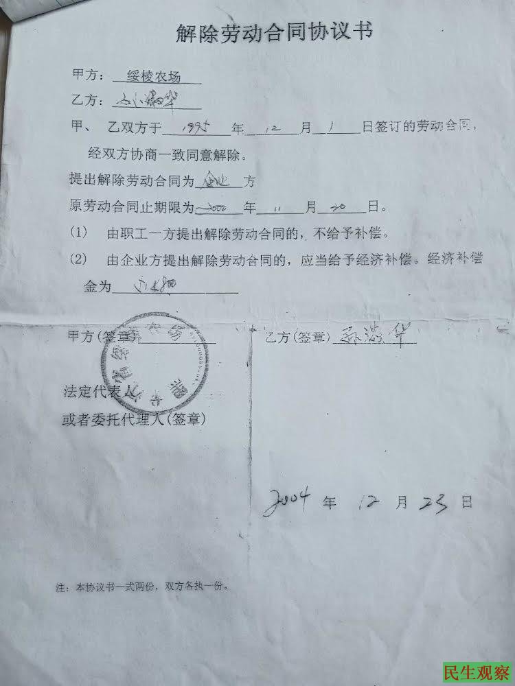 2018年,孙淑华在住院后办理出院手续时,被医生告知身份为“家属”,而非职工。返回绥棱农场后,孙淑华向计财科询问,被告知档案中存在一份解除劳动的合同协议,协议显示孙淑华已领取5148元补偿金。但孙淑华从未签署该协议,也未实际领取款项。
