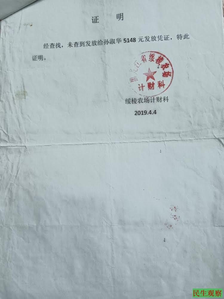 经孙淑华要求,计财科经一个月核查后出具书面证明:“经查找,未查到发放给孙淑华5148元的发放凭证。”农场方面承认协议造假,称系“历史遗留问题”,提出无法恢复职工身份,但可按职工待遇补偿(每月差额120元),并要求孙淑华缴纳家属医保,农场报销25%费用。孙淑华接受该方案后,因法院及分局局长陈超以“全总局类似情况人数众多,无力赔偿”为由拒绝执行,法院以“超期”为由驳回孙淑华诉讼请求。