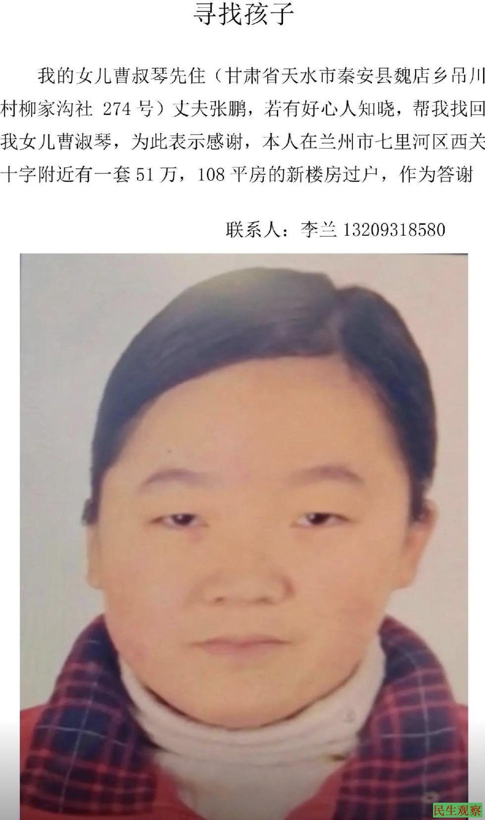 若有好心人知晓,帮其找回女儿曹淑琴,为表示感谢,她将自己在兰州市七里河区西关十字附近的一套51万,108平米房的新楼房给予过户作为答谢!