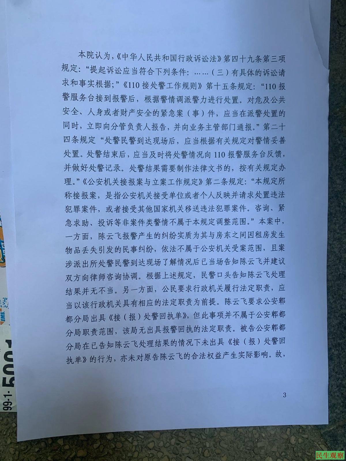 见此情景,陈先生和朋友报案。警方来后,陈先生反覆跟警察说,由于四年前办陈先生案子的警察违法办案(抓了陈先生,赶走他母亲,然后抄家,并且对没有拿走的东西不清点打包,也没及时通知陈先生家属领东西,),这样东西丢了,谁都知道找谁-谁搞丢的就找谁。警察没有给报案回执,说是陈先生与房东的租房纠纷。陈先生及时纠正并坚持索要报案回执,行政诉讼警方提供的出警视频得到证实。警察也只好叫陈先生他们去派出所。