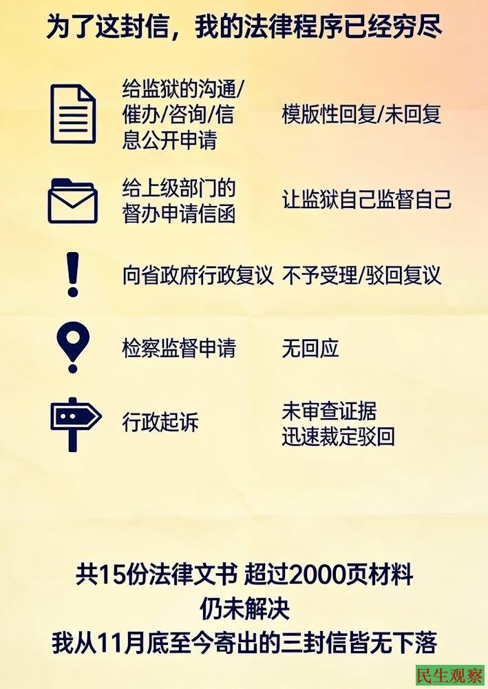 我穷尽了所有法律途径,但结果是:处处碰壁,无一例外。不是我的法律文书不对,而是整个制度设计让维权根本不可能成功。在“刑罚执行”这四个字面前,监狱成为“法外之地”,监督机关成为“摆设”,公民的基本权利成为“纸面权利”。