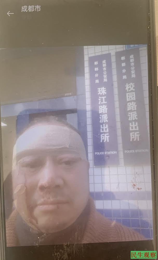 【民生观察2026年1月10日消息】四川成都市异议人士陈云飞,此前被成都市公安局郫都区分局珠江路派出所逼迁,因不服不愿搬家、拒绝噤声,近日陈云飞在租住的小区里面遭遇流氓的暴力打伤。而近期陈云飞所做的事情仅仅是,看望了黄琦的九旬母亲,以及为成都秋雨教案发声。