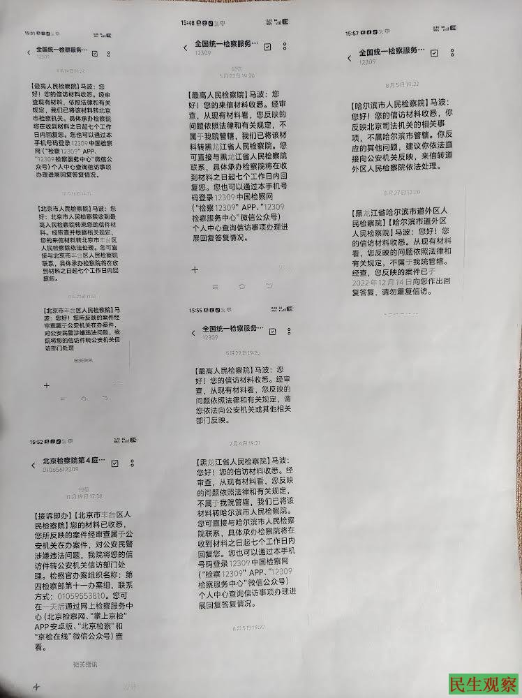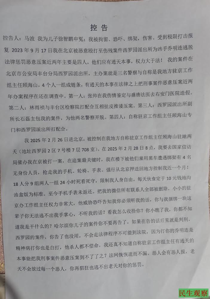 【民生观察2026年1月23日消息】黑龙江佳木斯市维权访民马波,因儿子遭校园暴力致死和在京被打伤警方不抓捕打人凶手而上访维权。近日,马波在北京维权访友期间多次遭到北京警察面谈和拦截扣押,并查看其上访材料和病例。