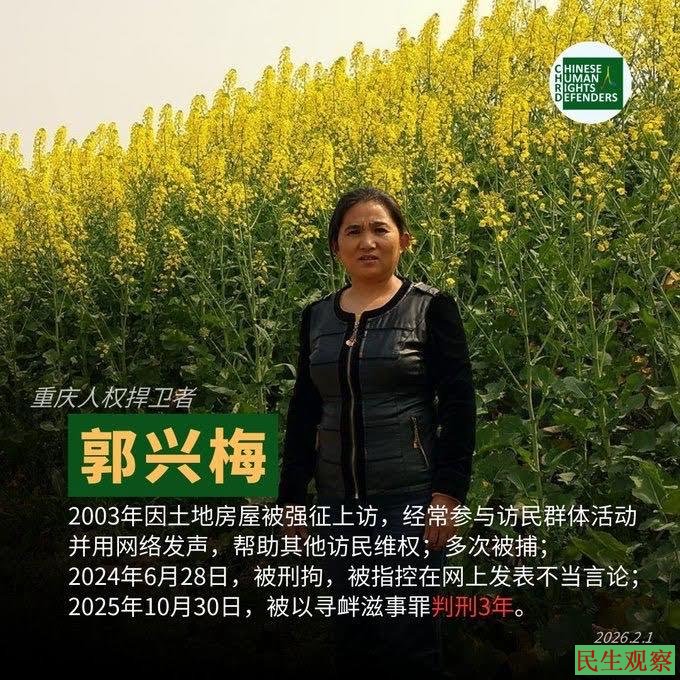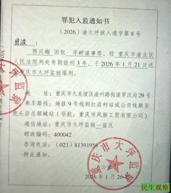 据家属消息,郭兴梅已于2026年1月21日,从渝北看守所送入重庆市大坪监狱服刑。地址:重庆市九龙坡区渝州路街道罗汉沟29号。