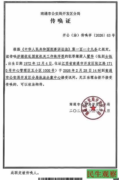 昨天下午也就是2026年2月28日,南通市公安局开发区分局民警,直接到瞿华居住的宾馆对她进行了传唤,理由是涉嫌扰乱国家机关工作秩序罪。
