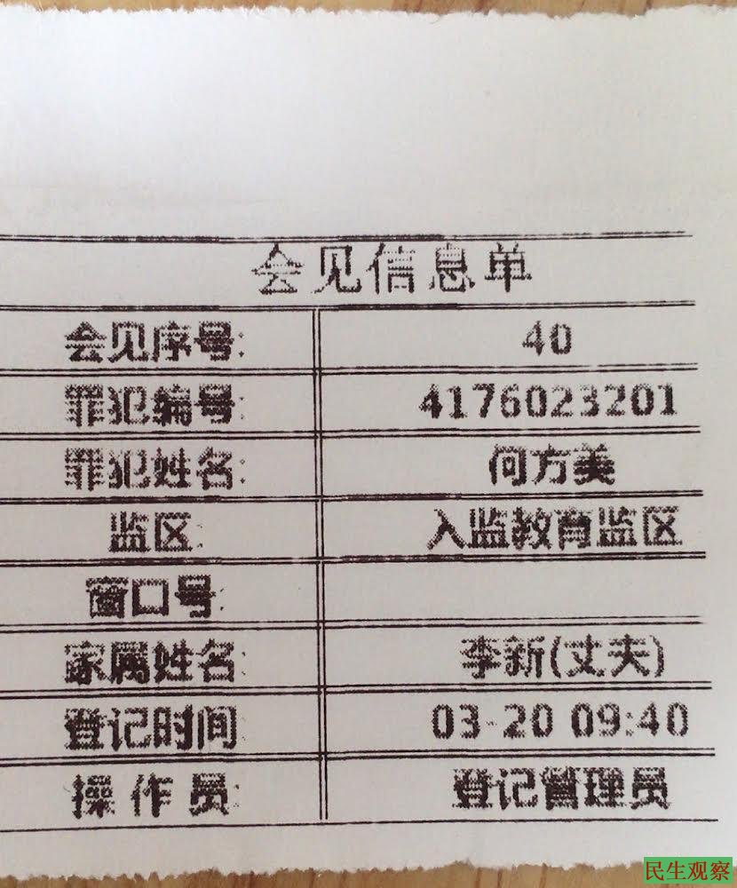 3月20日,距离何方美释放还有287天。当日上午将近十一点的时候,李新在中牟县金龙路168号郑州女子监狱成功会见到了妻子方美。