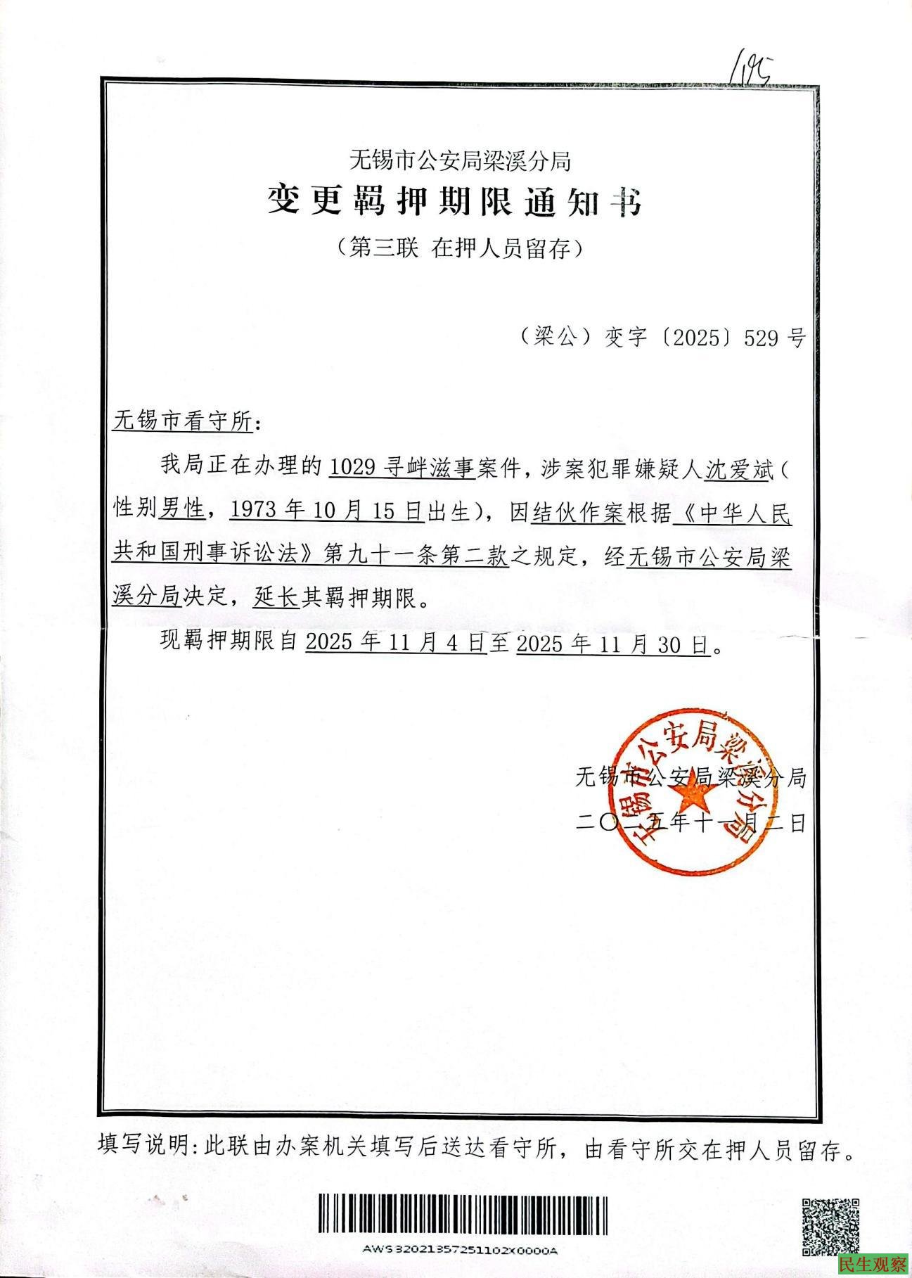 被监视居住日期:2025年11月30日,释放当日