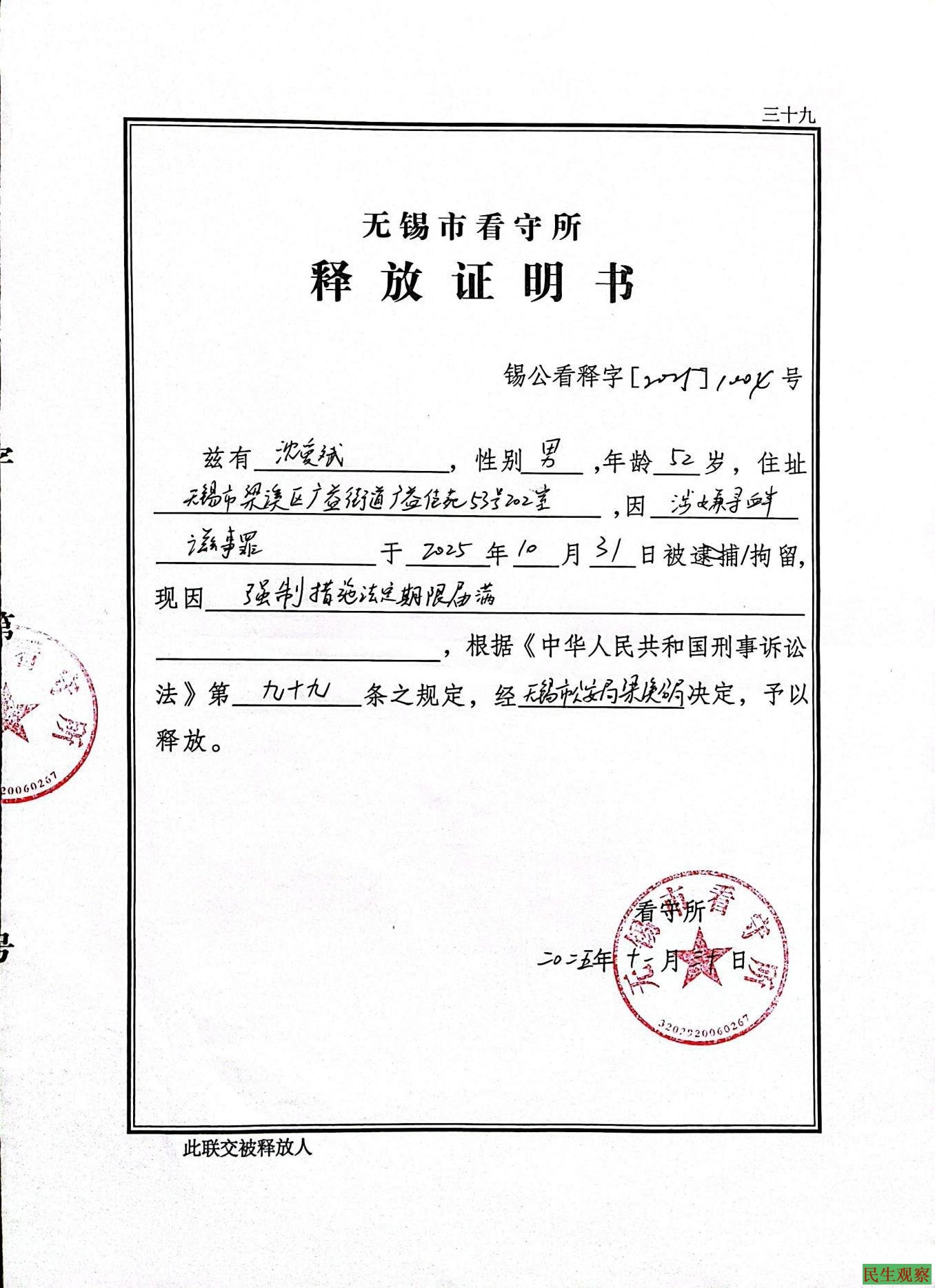 2025年4月30日沈爱斌从江苏省溧阳监狱释放,因无锡市公安局与溧阳监狱勾结,导致沈爱斌在溧阳监狱服刑期间遭受一系列滥权迫害,出狱时沈爱斌全身是伤病,且身无分文,到10月30日被抓捕,仅隔6个月。