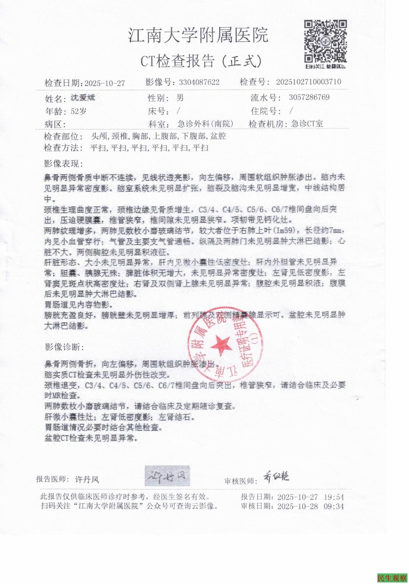 120救护车将沈爱斌送到无锡市江南大学附属医院南院抢救室,紧急抢救CT检查,确认头部没有出血,只有外伤,双侧鼻骨骨折,左侧鼻骨伴移位(塌陷),五官科医生当晚会诊,确定要做鼻骨恢复手术,并让沈爱斌10月29日挂五官科杜主任专家号确定手术治疗方案。