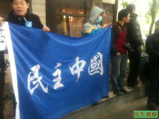 照片:2013年1月9日南方街头行动者在南方周末报社门口打出“民主中国”标语